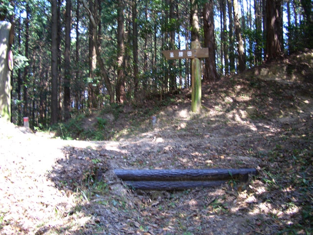 正面には道標が立てられ「至勝田」と書かれ、直進してヒノキ林の中を下っている。