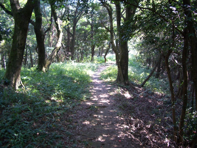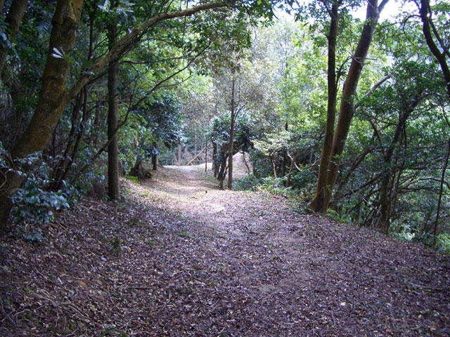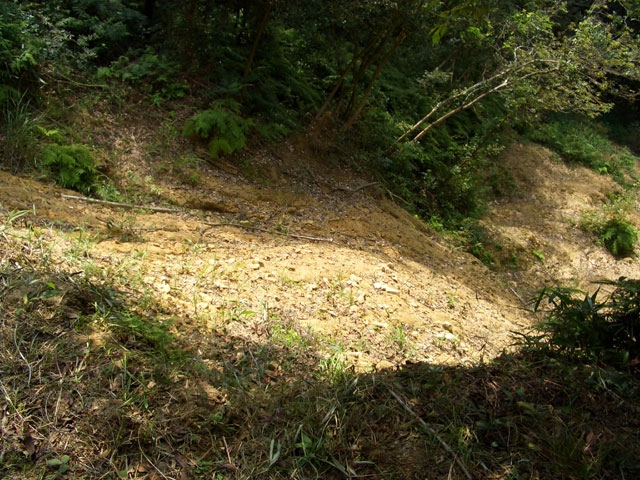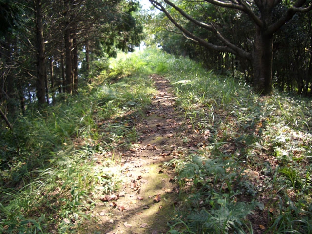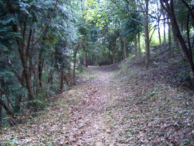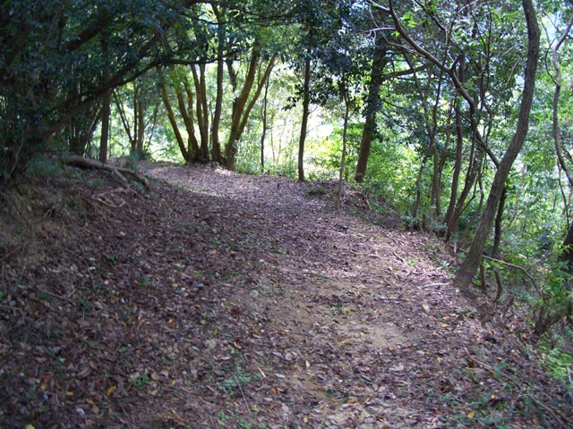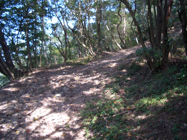 その崩落した上部を右手へカーブしていくと、落ち葉の平らな道になる。