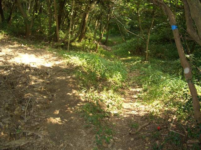 内側コースは、そのまま直進し4〜5分も車道を行くと、行き止まりになり右手の丸太橋を渡り、左手に小石垣の説明板を見て、すぐ先の道標から左折し小石垣を目指し、土塁を5〜6分も行けば外周コースに出会う。