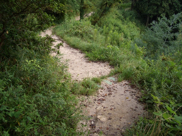 分岐を左手へゆるやかに下ると、すぐミゾ道になる。