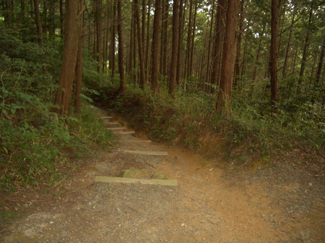 ほぼ平坦な道を左手へカーブし下って行くと木段になる。