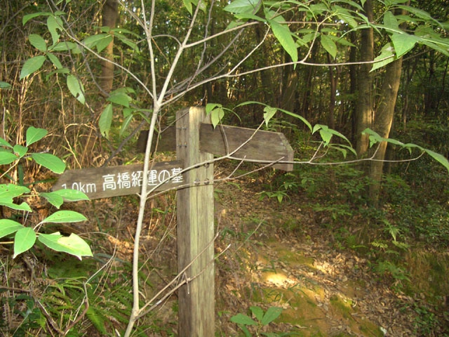 右手、池の縁を通ってきた道と出会う場所に道標が立てられ「岩屋城跡 高橋紹運の墓:1・5km」と案内されている。