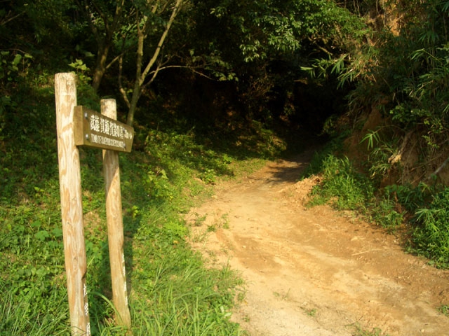 明かりを見て、深呼吸しながら蛇行して下るとT字形の分岐に出会い、右手に道標が立てられている。