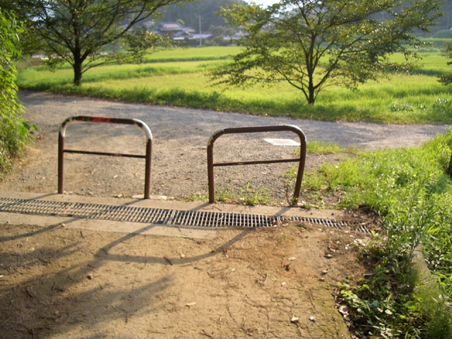 道標を見て10メートルも進み、車止めを抜け車道に出る。