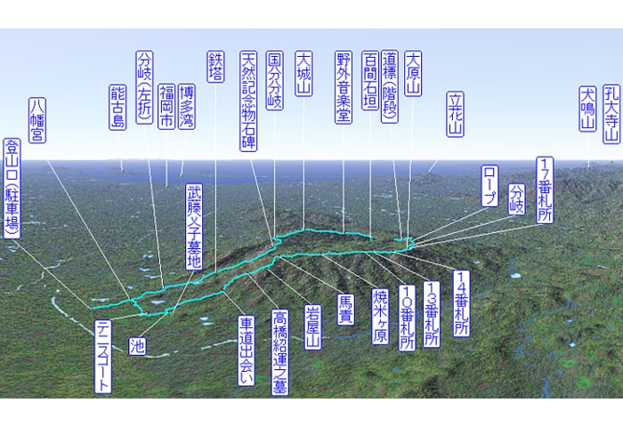 HOME > 九州の山 > 福岡県の山 > 四王寺山 > 高低図・3D概要図